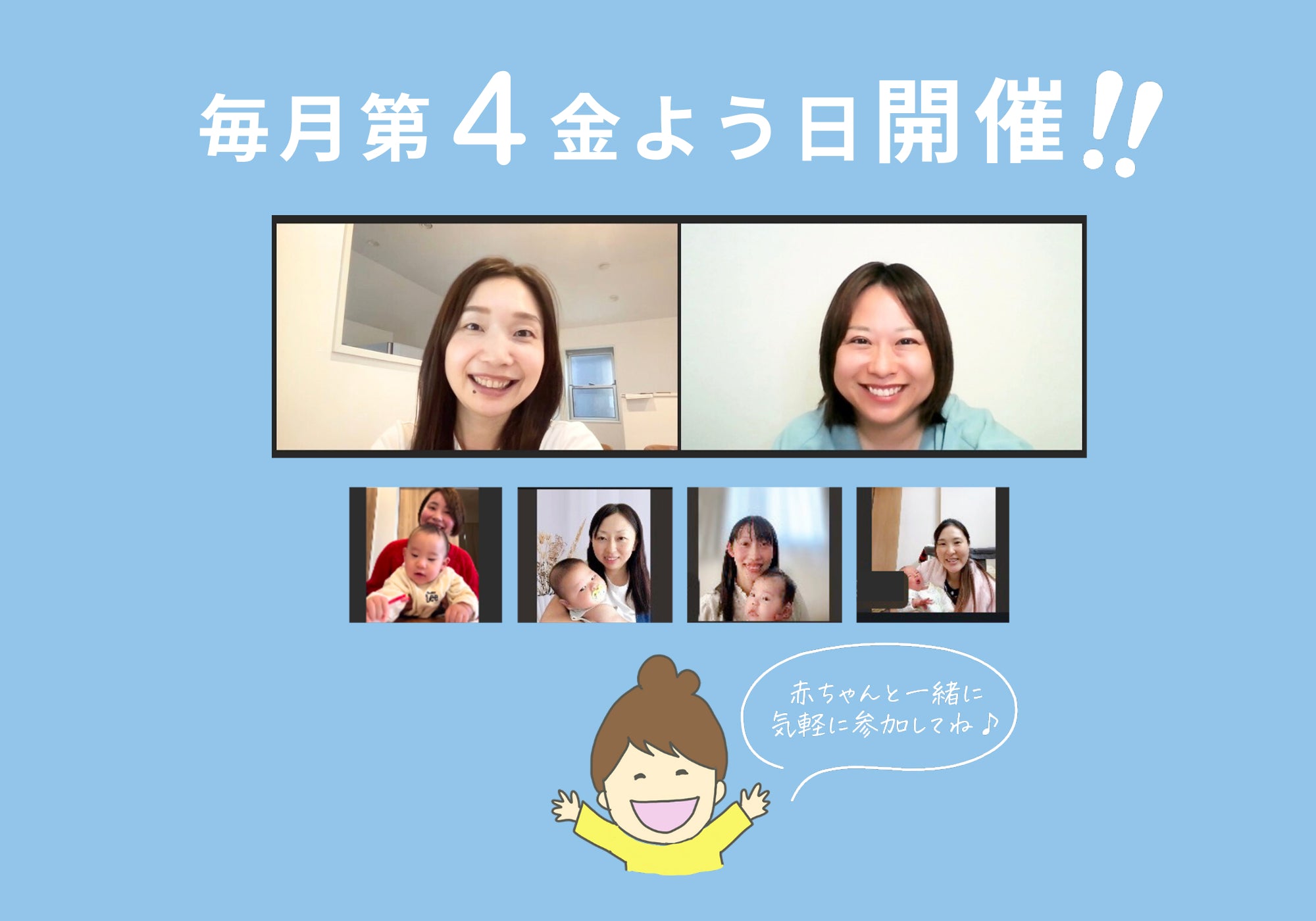 月に1回、経験豊富な助産師さんがあなたのケアのお悩みに寄り添い最適なケア方法をアドバイス。参加いただいた方からは「自分に合ったアドバイスをもらえて安心した」「授乳の悩み、上の子への関わり方など、ケアのこと以外も聞けて参考になった」とご好評です◎