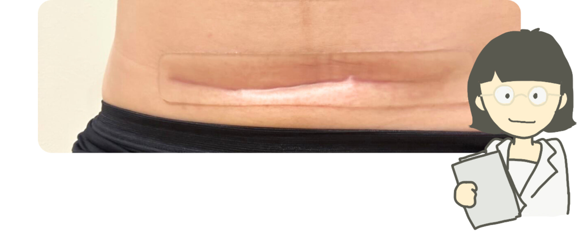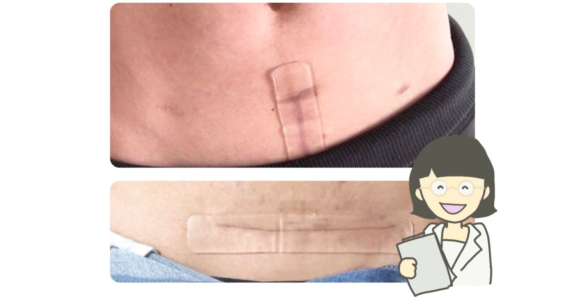 縦切開の場合、横切開に比べてお腹の皮膚が伸縮しやすく、テープが浮いたり剥がれやすくなる可能性がございます。あらかじめご了承のうえ、ご使用ください。なお、「剥がれやすいケース」や「剥がれにくくする対策」は公式Instagramでご紹介しております。ぜひご覧ください。▶︎公式Instagram参照