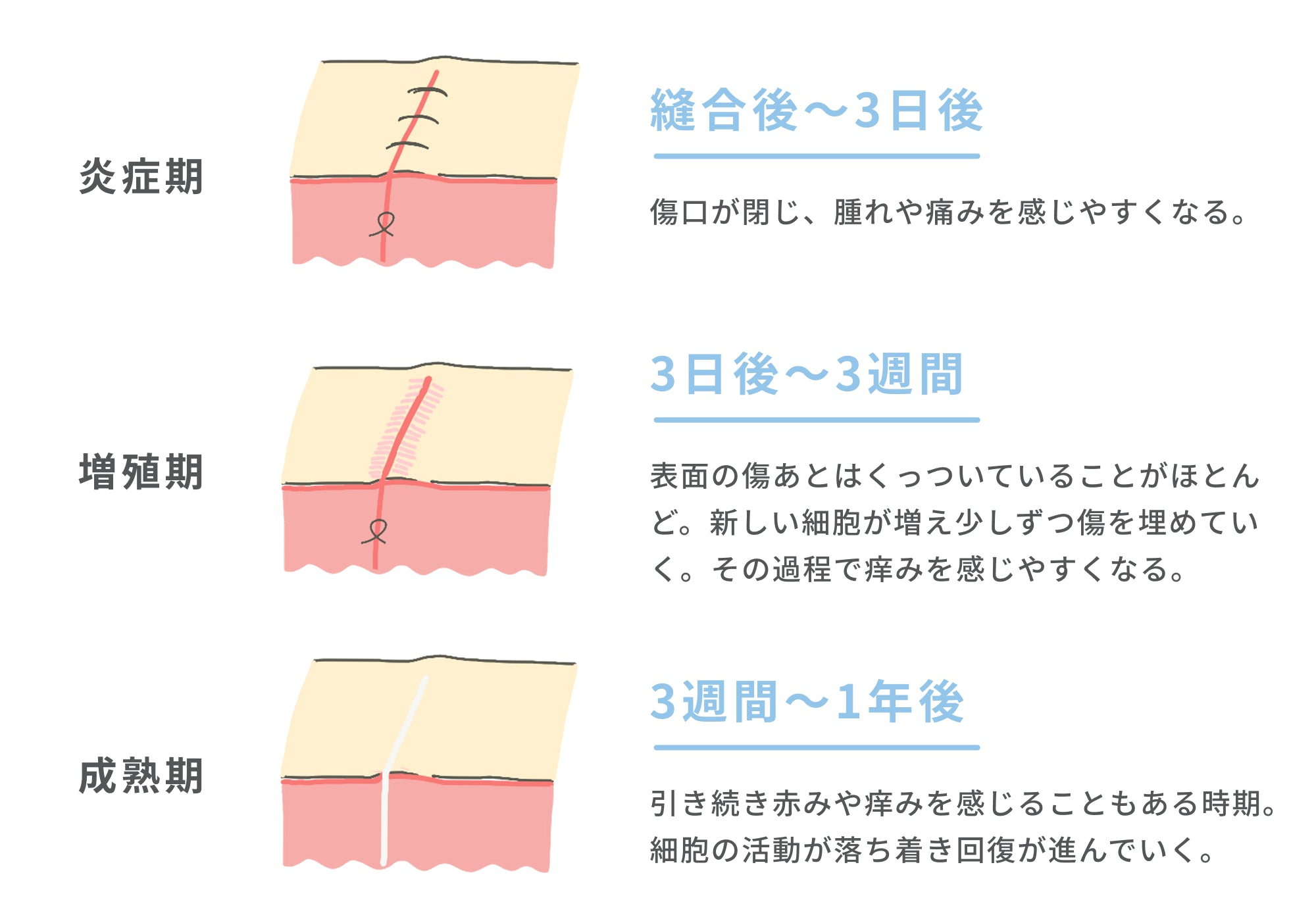 術後に皮膚を縫い合わせた傷あとは、3日程度で傷口が閉じる。傷口が閉じてからも皮膚の下では炎症は続き、炎症期・増殖期・成熟期を経て治っていくといわれている。この期間のケアが重要!