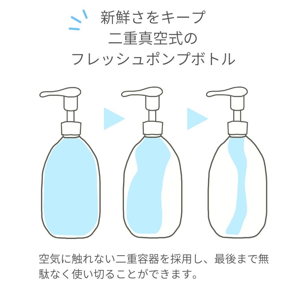 次にポンプ式は最後の方が出しづらく使い切るのが難しかったのですが、このボトルは最後まで無理なく使い切れること。(後に二重構造で最後まで新鮮な状態で使い切れることを知りました!)