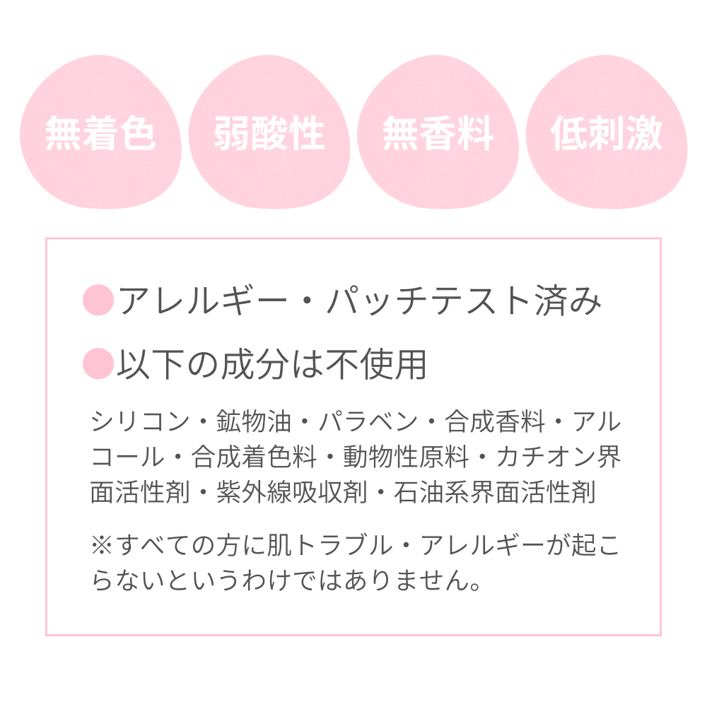 敏感なママの肌にも生まれたての赤ちゃんの肌にも使えるように、無香料・無着色・低刺激処方にこだわりました。