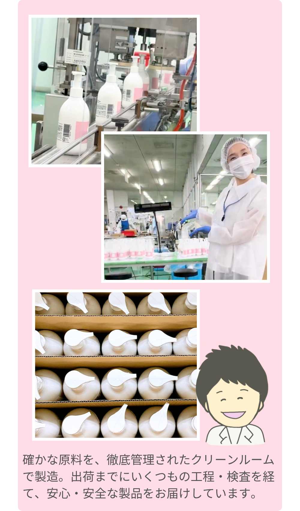 毎日安心して使えるように、開発から生産まですべて一貫して国内で行っています。家族みんなでたっぷりケアしてほしいから、高保湿で肌にやさしいだけでなく、続けやすい価格にもこだわりました。必要なものだけをぎゅっと詰め込んだ、シンプルで、うれしい一本です。