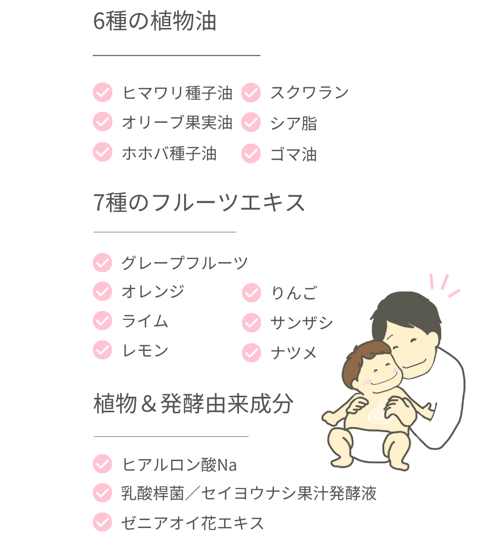 さらっと心地よいのに 、うるおいはしっかり。伸びも良くベタつかないから、シーズンを選ばず日々のケアや親子のスキンシップにもぴったりです。